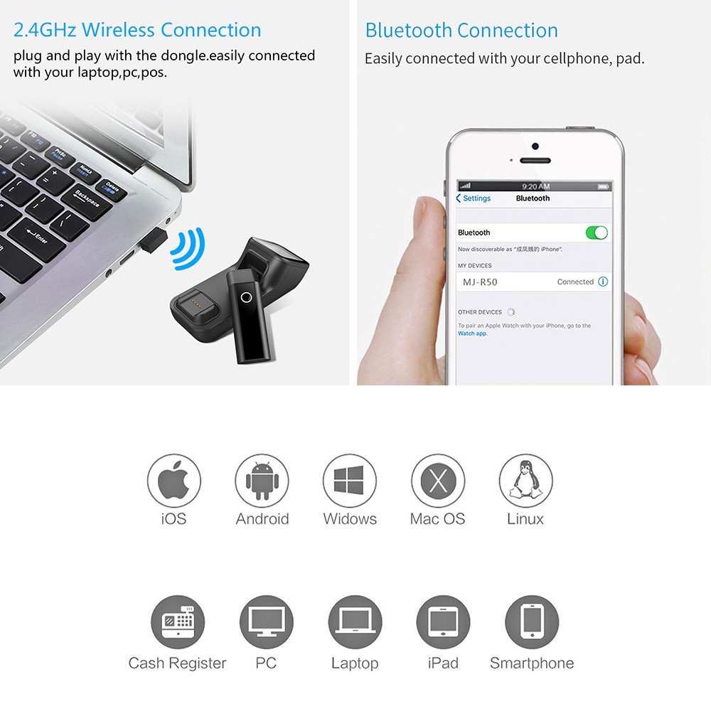 The Symcode R50 is a cutting-edge barcode scanner that combines a hybrid mode with a desktop presentation, allowing it to face customers and efficiently scan both mobile and printed barcodes. Users have the flexibility to switch to handheld mode by holding the cordless scanner, adapting to their scanning needs. The R50 offers wireless communication options, including 2.4GHz frequency and Bluetooth connectivity, enabling seamless data transmission to the host device within the specified range.